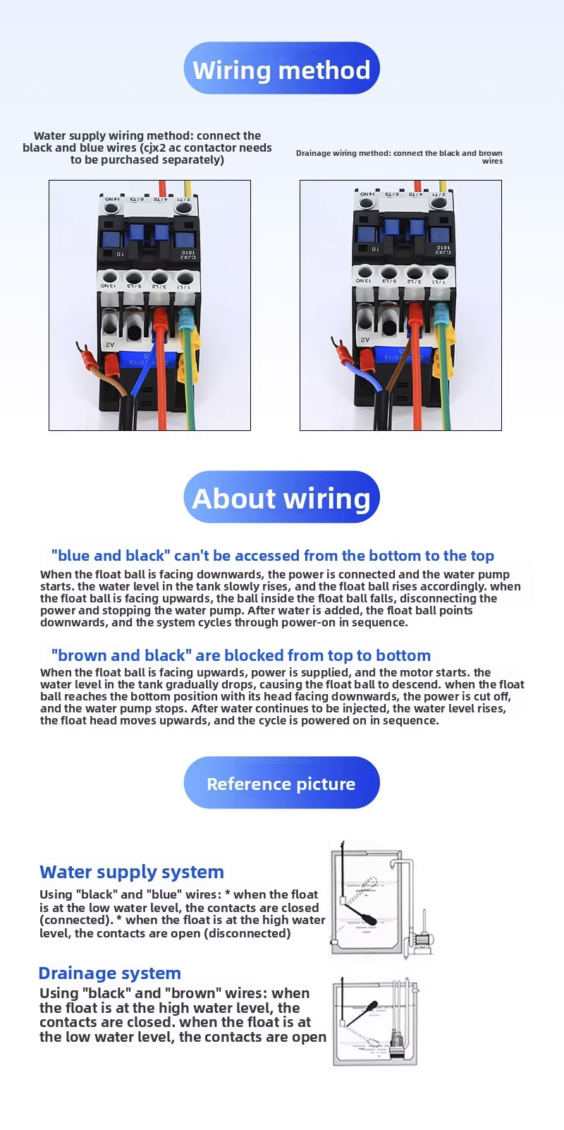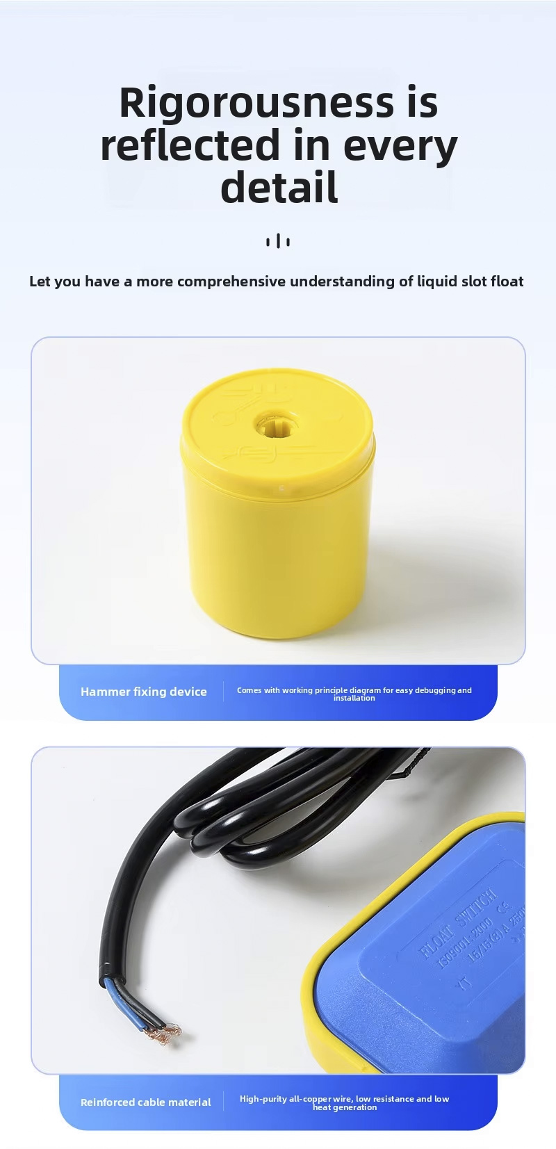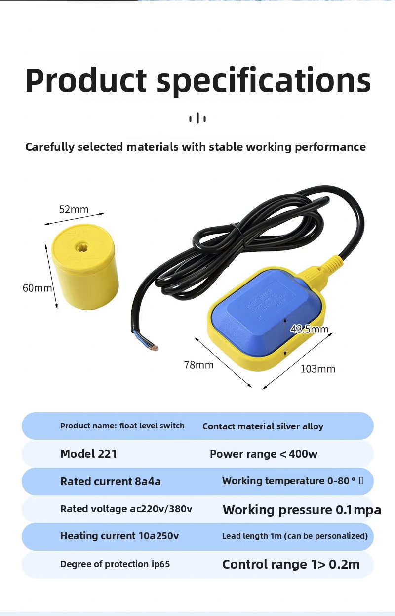 ဤ float switch သည် 2m 、 3m 、 5m 、 10m ၊ IP68 အကာအကွယ်အဆင့်ဖြင့် ကြီးမားသော စက်ဝိုင်းပုံစံဒီဇိုင်းကို ပါ၀င်ပြီး အပူချိန် 0 ℃ မှ 80 ℃ ၊ ၎င်းသည် ကျယ်ပြန့်သောဗို့အားအကွာအဝေး 110V မှ 220V အထိ ထောက်ပံ့ပေးပြီး ± 0.5Mpa ၏ ခိုင်မာသောအလုပ်ဖိအားတစ်ခုပါရှိသည်။ အဆိုပါထုတ်ကုန်သည် OEMs လိုဂို၊ လေဆာဖြင့် စိတ်ကြိုက်ပြင်ဆင်နိုင်သည် ဝန်ဆောင်မှုများ၊ မတူကွဲပြားသော အပလီကေးရှင်းများအတွက် လိုက်လျောညီထွေရှိစေရန် ဆောင်ရွက်ပေးပါသည်။