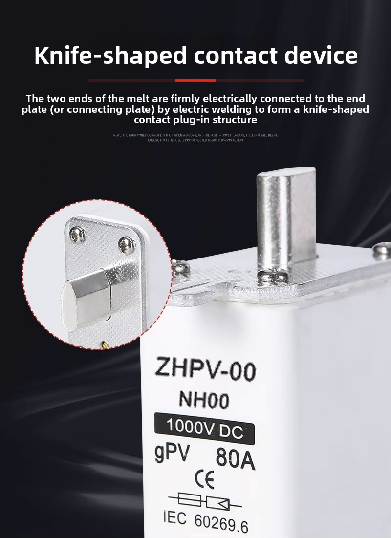 NH00-1000V IEC Low Voltage Photovoltaic Knife Fuse ပလပ်စတစ် 80A 6ka ကွဲထွက်နိုင်မှု