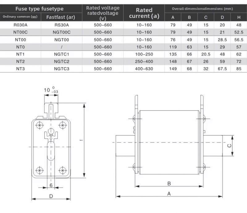 NT/NH Blade အမျိုးအစား fuse-links aM အတန်းအစားသည် မော်တာကာကွယ်ရေးအတွက်ဖြစ်သည်။ ဤမြင့်မားသော ကျိုးပေါက်နိုင်သော fuse-links များသည် မော်တာများ၊ transformer နှင့် high inrush current ရှိသော အခြားသော load များတွင် circuit short circuit များကို ကာကွယ်ရန်အတွက် ရည်ရွယ်ပါသည်။ ထိပ်စွန်းတွင် စံအမြင်အာရုံညွှန်ပြချက်တစ်ခုရှိပြီး ရှေ့ဘက်တွင် ချန်လှပ်ထားနိုင်သည့်အရာတစ်ခုရှိသည်။ ဤစီးရီးများတွင် အရွယ်အစား NH000 မှ NH4 အထိ fuses များပါ၀င်ပြီး၊ အဆင့်သတ်မှတ်ထားသော ရေစီးကြောင်းများ 1250A အထိ၊ အဆင့်သတ်မှတ်ထားသော ဗို့အား 690V အထိရှိသည်။