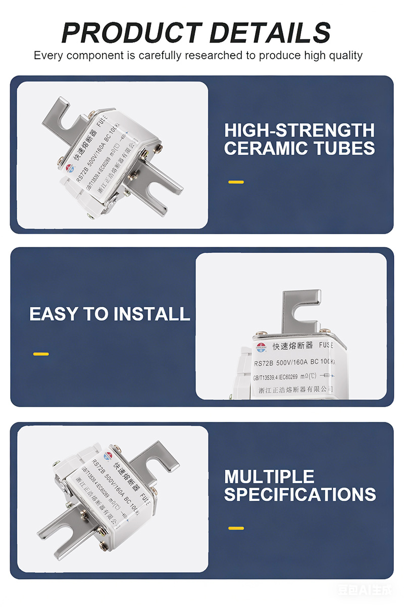 RS72B 500V 160A BC 100KA Fuse Links များသည် ဗို့အားမြင့်ခြင်းနှင့် မြင့်မားသောလျှပ်စီးကြောင်းများကို ကာကွယ်ရန်အတွက် အထူးထုတ်လုပ်ထားသော စွမ်းဆောင်ရည်မြင့် စက်မှုဖျူးစ်တစ်ခုဖြစ်သည်။ RS72B 500V 160A BC 100KA Fuse Links များသည် အရည်အသွေးမြင့်ပစ္စည်းများဖြင့် ပြုလုပ်ထားပြီး အလွန်ကောင်းမွန်သော ဖောက်ထွင်းနိုင်စွမ်းရှိသည်။ 100KA ၏ အမြင့်ဆုံး circuit short-circuit လျှပ်စီးကြောင်းကို ခံနိုင်ရည်ရှိပြီး စက်ပစ္စည်းများ ပျက်စီးမှုကို ထိထိရောက်ရောက် ကာကွယ်ပေးပါသည်။