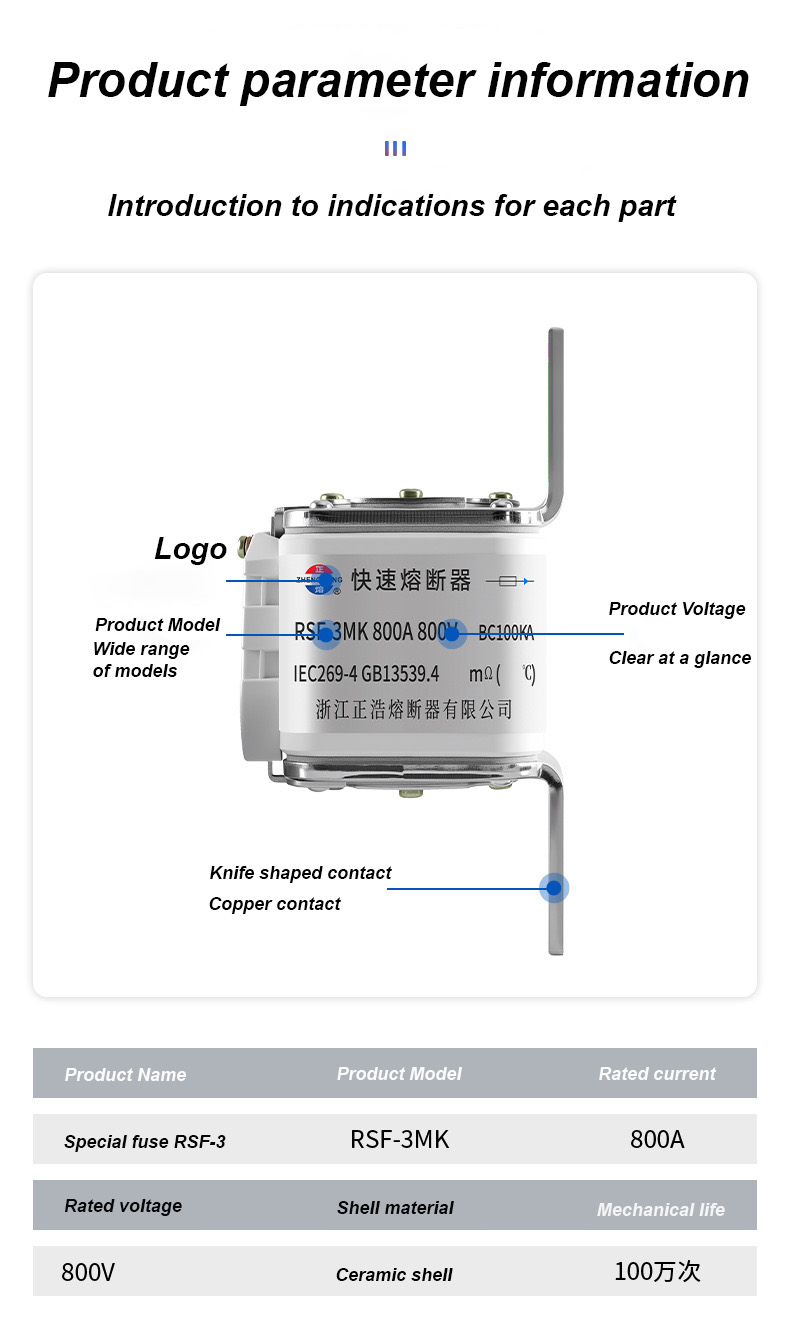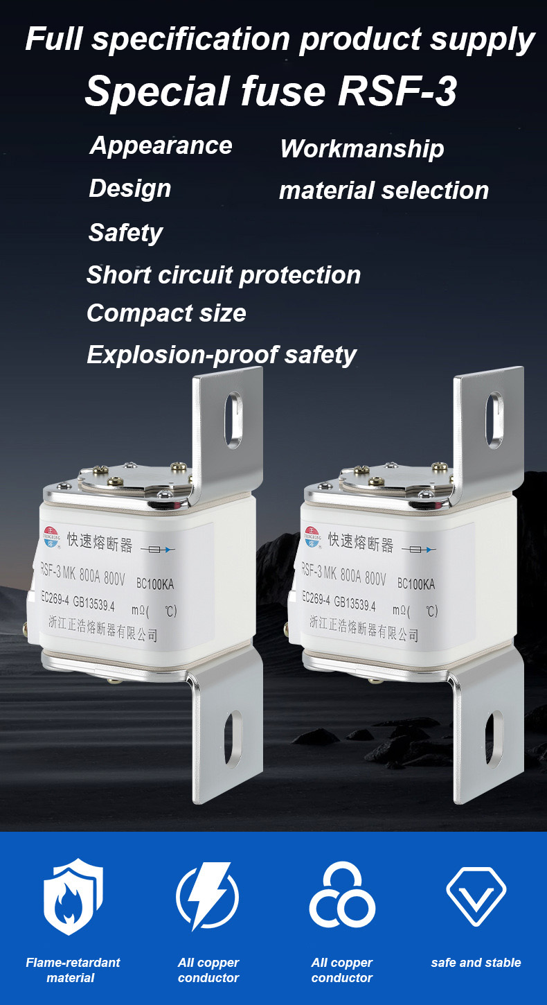 RSF-3MK 800V-800A BC100KA Fuse Links များသည် ပါဝါမြင့်မားသော လျှပ်စစ်ကာကွယ်ရေးအခြေအနေများအတွက် သင့်လျော်သော စွမ်းဆောင်ရည်မြင့် စက်မှုဆားကစ်ဘရိတ်ကာတစ်ခုဖြစ်သည်။ RSF-3MK 800V-800A BC100KA ဖျူးလင့်များ အဆင့်သတ်မှတ်ထားသော ဗို့အား 500V နှင့် 315A အဆင့်သတ်မှတ်ထားသော လျှပ်စီးကြောင်းပါရှိပြီး လျှပ်စစ်အန္တရာယ်ကင်းရှင်းစေရန်၊ ဝန်ပိုခြင်းနှင့် ဝါယာရှော့မဖြစ်စေရန် ထိရောက်စွာအာမခံနိုင်ပါသည်။ RSF-3MK 800V-800A BC100KA ဖျူးလင့်များ လျှပ်စစ်စနစ်၏ ယုံကြည်စိတ်ချရမှုနှင့် တည်ငြိမ်မှုကို ပိုမိုကောင်းမွန်စေမည့် မြင့်မားသောချို့ယွင်းနေသော လက်ရှိအခြေအနေများတွင် လျင်မြန်သော circuit ပြတ်တောက်မှုကိုသေချာစေရန် BC100KA breaking capacity ဒီဇိုင်းကို လက်ခံပါသည်။