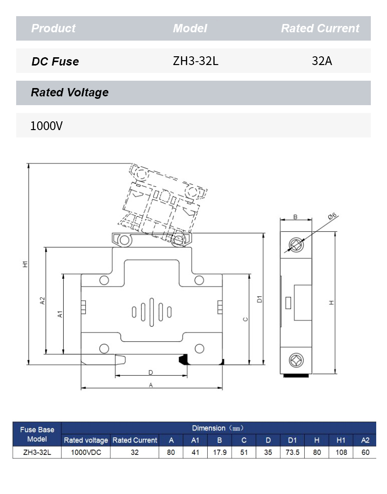 ZH32L DC 1000V Fuse Holder သည် photovoltaic နှင့် အခြားသော DC အပလီကေးရှင်းများတွင် လျှပ်စစ်ဆားကစ်များအတွက် ယုံကြည်စိတ်ချရသော ကာကွယ်မှုကို သေချာစေရန် ဒီဇိုင်းထုတ်ထားသော စွမ်းဆောင်ရည်မြင့် အစိတ်အပိုင်းတစ်ခုဖြစ်သည်။ ခိုင်ခံ့သောတည်ဆောက်မှုနှင့် သာလွန်သောလျှပ်ကာများပါရှိသော ZH32L DC 1000V Fuse Holder သည် 1000V DC အထိအဆင့်သတ်မှတ်ထားသော ဘေးကင်းလုံခြုံသောအိမ်ရှိ fuses များအတွက် သင့်လျော်ပြီး overcurrent နှင့် short-circuit ပျက်စီးမှုကို ထိရောက်စွာကာကွယ်ပေးပါသည်။